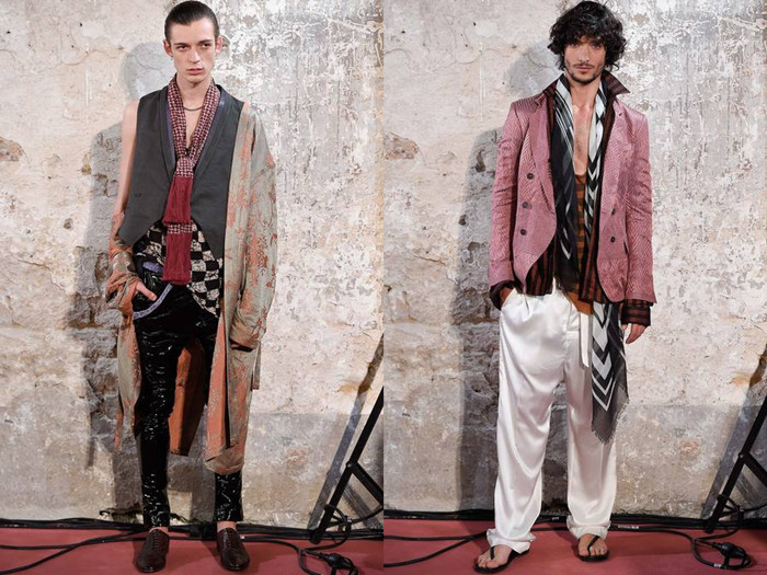 Haider Ackermann式的男人永远是他自己。丝绒学院夹克、提花精良的垮裤、松垮的衬衫外穿着合身的背心,层层叠搭乱中有序,加上唏嘘的胡渣,活脱脱宿醉未 醒的浪子形象,如果说有种风格叫做“毫不费力的雅致”(effortless chic),那么Haider Ackermann就是“邋里邋遢的雅致”(sloppy chic)。