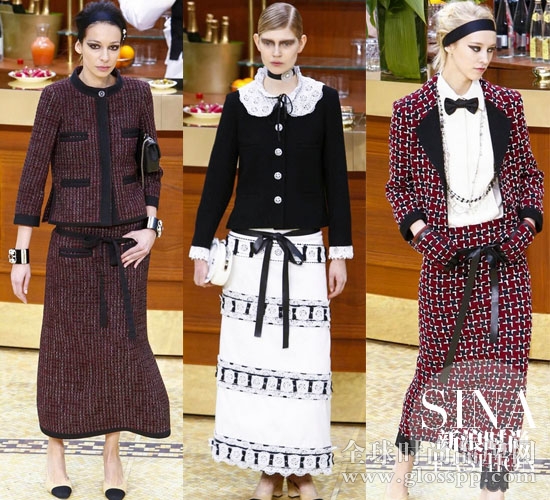 超模Cara身穿一件黑白套装亮相,经典两件套在腰部加入了银色腰带,手臂和侧身“充气”菱形纹配立体蝴蝶结装饰,端庄中展现了经典Chanel的少女气息,同样效果的套装还出现在了纯黑色和白色立领套装中。