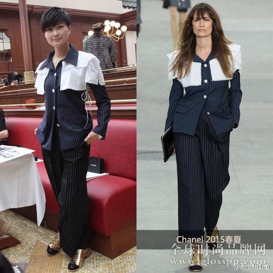 李宇春身着2015春夏高级成衣系列条纹西装搭配香奈儿黑金拼色平底鞋亮相Chanel 2015秋冬系列大秀现场,宽松的西装造型十分帅气潇洒,搭配着白色复古荷叶边装饰,更为凸显春春雅致及文艺气质。还有CHANEL高级珠宝 “Ultra”系列耳环及“Cosmique de CHANEL”系列戒指的同时又平添了几分奢华的味道。