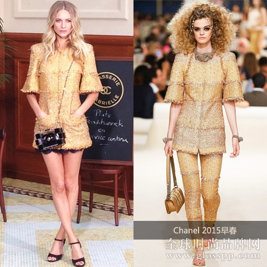 2015秋冬大秀依旧由老佛爷的心头肉Cara开场,妹妹开秀姐姐Poppy Delevingne自然前来捧场,身穿Chanel2015早春系列金黄色长款外套的Poppy Delevingne看起来十分贵气奢华,斜挎着Chanel Boy手袋使LOOK更为轻松、活泼。