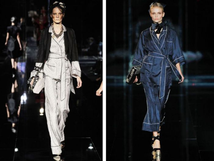 1960年,Irene Galitzine用宽松优雅的丝绸和珠片条纹创造“Palazzo Pajamas”,以睡衣为名,为非正式晚宴的礼服提供了一种全新的选择,睡衣也愈发向时装靠拢。再之后可以再各种时装秀场上看到睡衣外穿的影子,从Dolce&Gabbana 2009春夏秀场的女孩们穿上睡衣开始,这件时尚单品在新世纪几乎成为了高级时装潮流本身,各大时尚icon衣橱中必备的款。