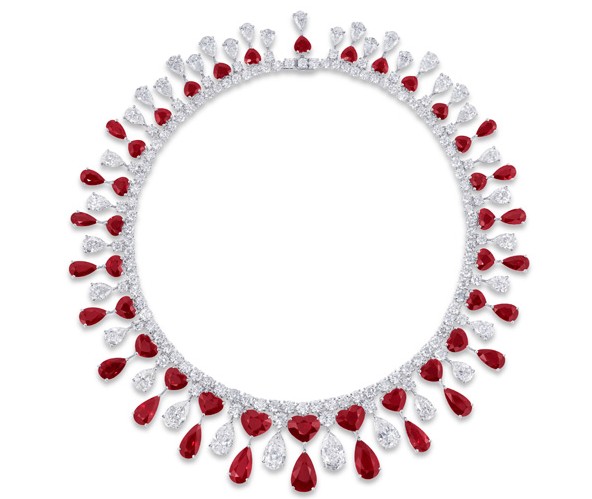 格拉夫多形切割钻石和红宝石项链钻石共重69.40克拉,红宝石共重108.10克拉